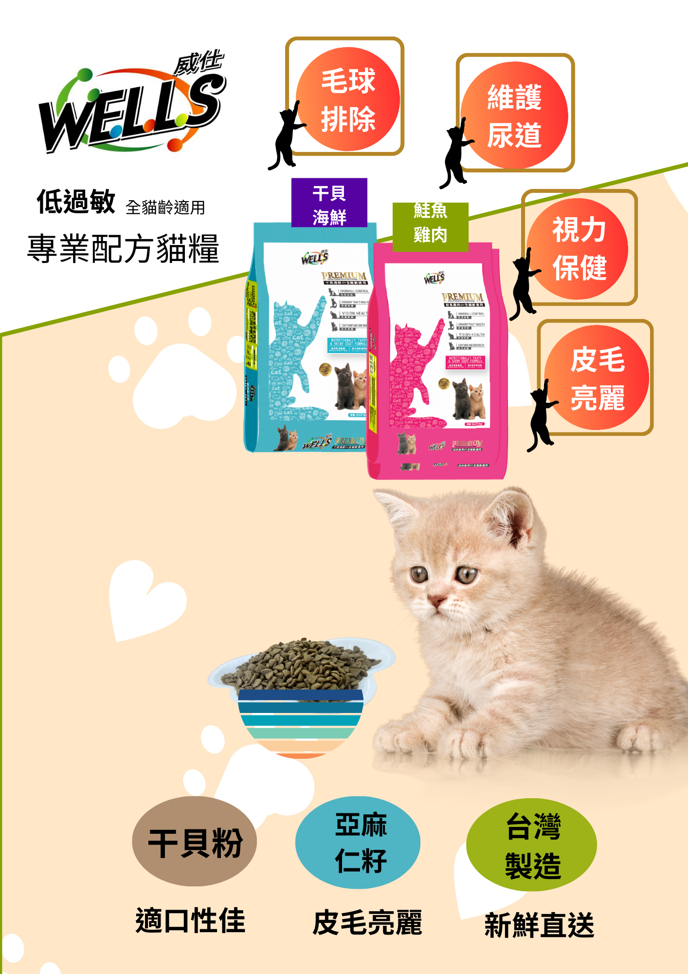 Wells-威仕 低過敏保健貓糧採用低過敏食材,提供完整的營養。