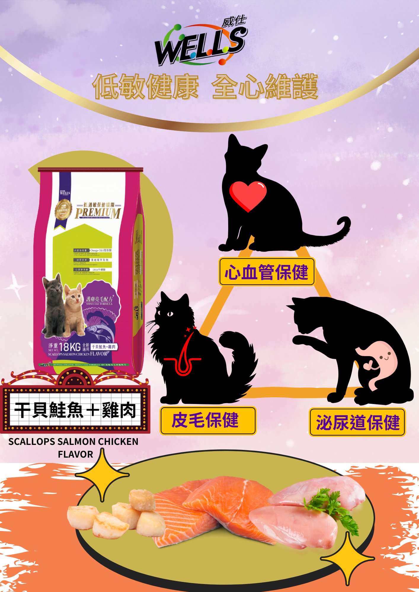 WELLS威仕低過敏保健貓糧 採用低過敏食材,提供完整的營養。